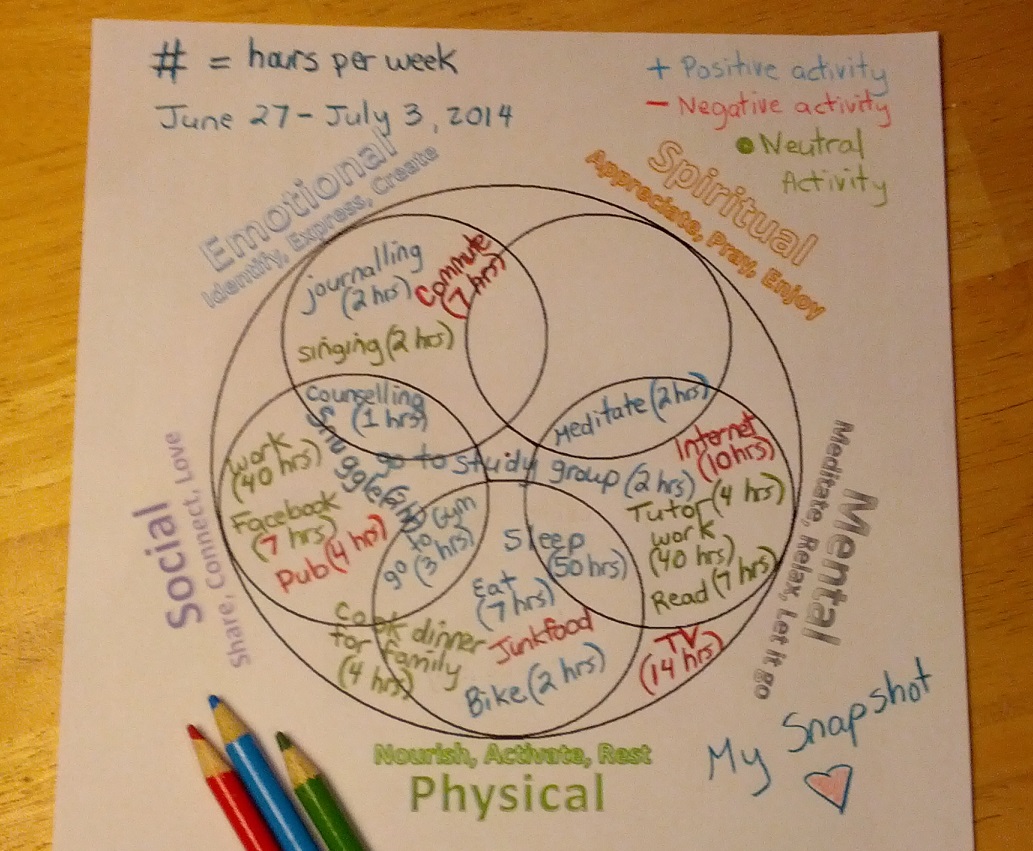 Once you have worked your way through a typical day, add weekly or intermittent activities to your chart and give those activities numbers to reflect how they improve or remove from your health and happiness.