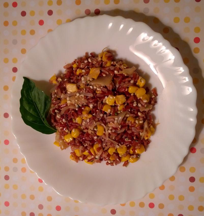 Mix red rice, corn, hemp and kim chi/ sauer kraut together in a large bowl. Blend the hot sauce and mayonnaise together and pour it over the rice mixture. Stir until everything is coated. Taste, adding Salt and Pepper and making adjustments to suit your preferences for sourness or spiciness.